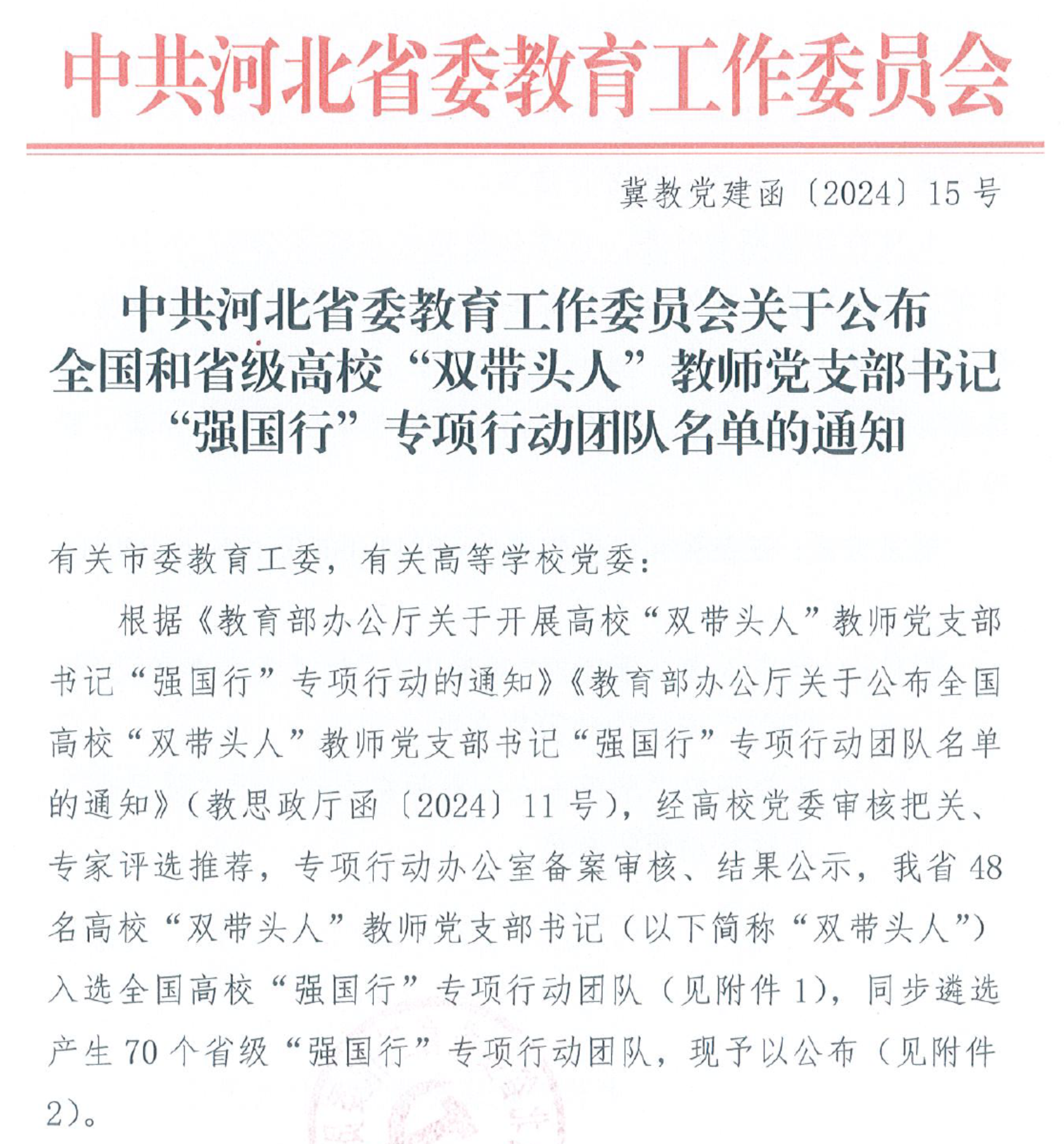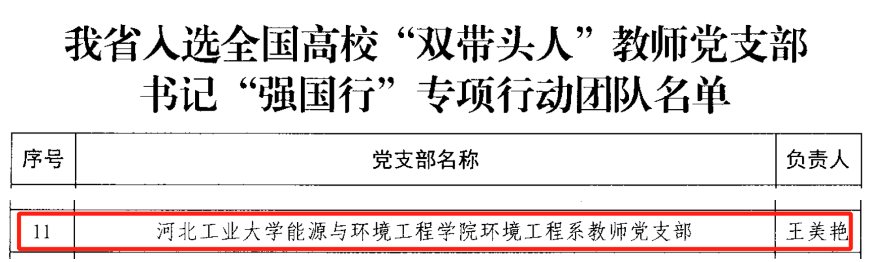 近日,教育部办公厅和河北省委教育工作委员会发布了《关于全国高校“双带头人”教师党支部书记“强国行”专项行动团队名单的通知》,河北工业大学百家乐app下载 环境工程系教师党支部成功入选全国高校“双带头人”教师党支部书记“强国行”专项行动团队。