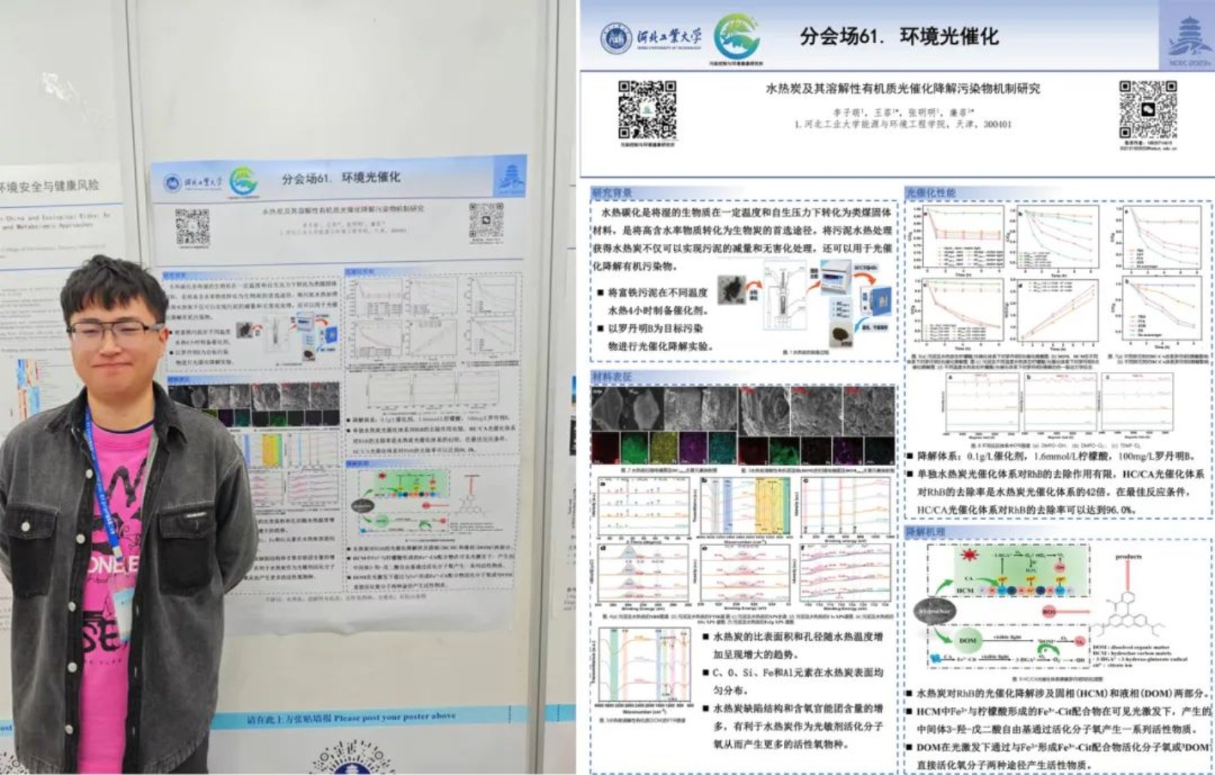 李子萌同学制作了“水热炭及其溶解性有机质光催化降解污染物研究”主题墙报,展示了水热炭及其溶解性有机质优良的光催化性能,揭示了水热炭对罗丹明B的光催化降解机理,在光催化分会场展示了我所学生的优秀科研成果。