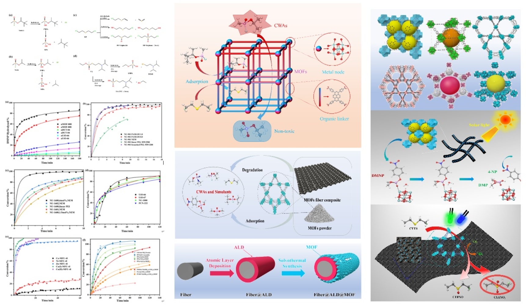 在一些特殊工矿企业和军事场所,危化品泄露往往严重威胁人员生命健康,泄露的气体中大多含有多类型剧毒VOCs或化学毒剂,传统的防护材料一般采用碳基或者改性碳基材料,存在吸附剂吸附性能低、重量重等缺点。特别是CWAs等各类危险化学物在世界各地依然屡次出现,但对于CWAs的解毒研究仍然任重道远。金属有机框架材料(简称MOFs)是一种多孔且稳定的材料,已被广泛应用于CWAs的解毒研究。但截至目前,对化学战剂的吸附降解或防护装备的开发研究相对较少。因此需要深度探讨CWAs的解毒策略、新型解毒MOFs材料的开发以及MOFs复合材料在防护装备中的应用情况。