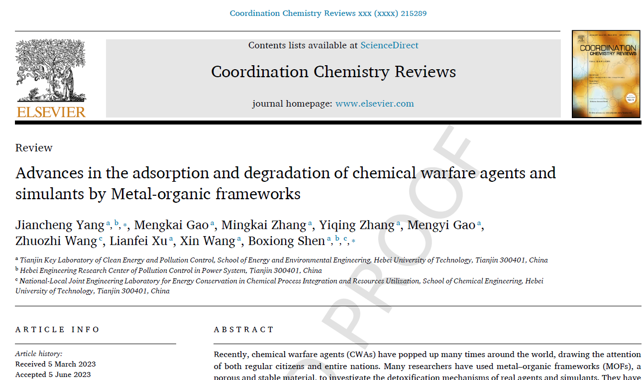 近日,河北工业大学百家乐app下载 能源利用过程污染物控制技术研究所杨建成副教授、沈伯雄教授、能源动力专业2021级硕士研究生高梦凯等在化学毒剂(化学战剂, CWAs)解毒去除领域取得重要进展,相关工作以 “Advances in the Adsorption and Degradation of Chemical Warfare Agents and Simulants by Metal-Organic Frameworks” 为题录用发表于化学领域国际知名期刊Coordination Chemistry Reviews(配位化学评论)。