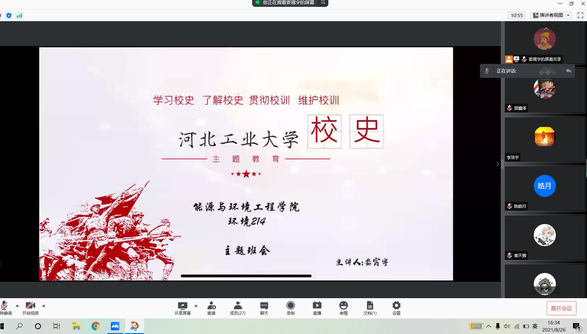 环境214班娄霄宇组织同学们利用腾讯会议召开主题班会,学习并了解河北工业大学校史,环境DE211班和其他班级通过征集校史学习感想,引发了同学们学习校史的热潮。百家乐app 21级各班通过多种形式云参观河北工业大学校史馆,使同学们进一步了解了学校的历史,增强对学校的认同感、归属感。