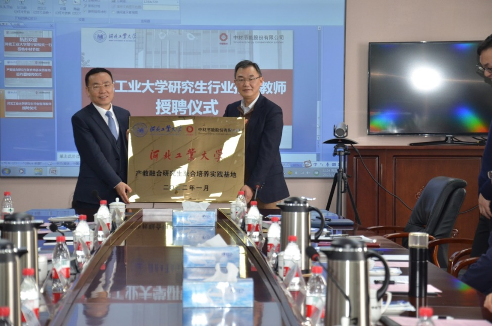副校长胡宁代表学校向中材节能股份有限公司授牌“河北工业大学产教融合研究生联合培养实践基地”,中材节能股份有限公司董事长孟庆林接牌
